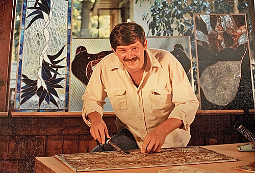 The simple desire to add color to my entry way door sparked my interest in stained glass in the early 70's. Knowing nothing about glass or the process of making windows, I took a class at the local community college. In 1976 I was given a book by Otto Rigan entitled "New Glass." The book was full of amazing and unique glass work. The artist's ideas were fresh and their work exciting. In 1980 I attended Pilchuck Glass School in Stanwood, Washington, for a summer session with the renowned glass artist, Narcissus Quigliata and his assistant, Rachel Schutt-Mesrahi. Narcissus emphasized the importance of the lead line. Rachel's focus was panel execution. Their insights into the aesthetics and craftsmanship of glass were inspiring. My autonomous panels for private homes are